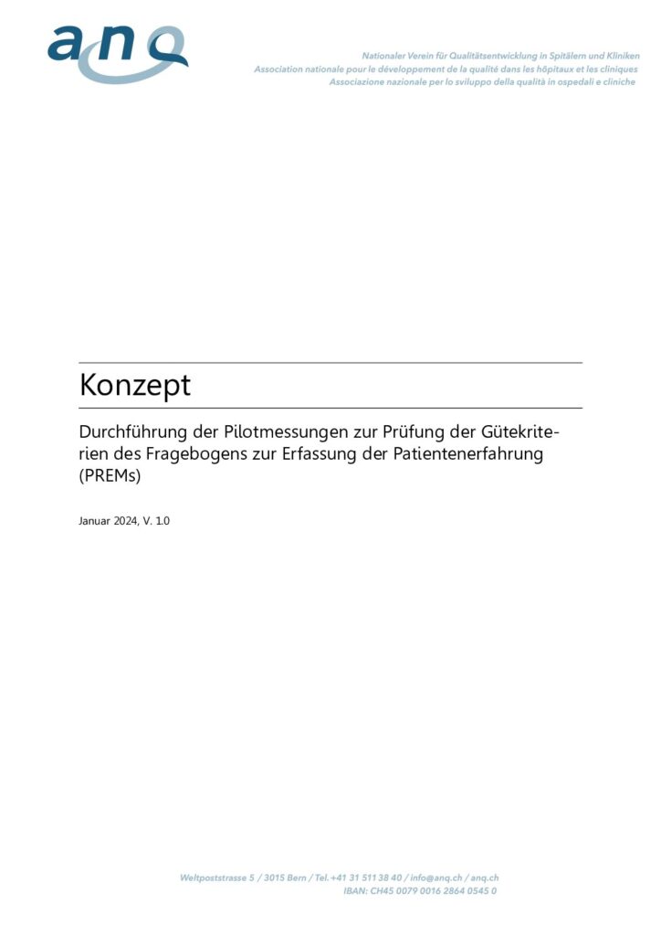 2024 finden Pilotmessungen statt, um die Gütekriterien des Swiss PREMs zur Erhebung der Patientenerfahrung in der Akutsomatik (Erwachsene), der Erwachsenenpsychiatrie und der Rehabilitation zu testen.