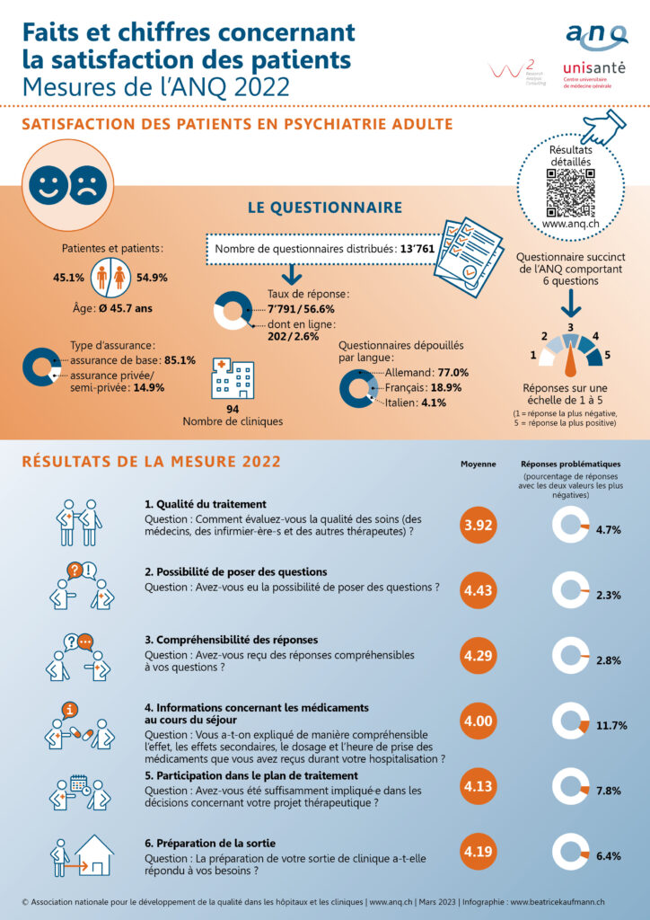 Aujourd’hui, l’Association nationale pour le développement de la qualité dans les hôpitaux et les cliniques ANQ a publié les résultats de la cinquième enquête de satisfaction menée à l’échelle de la Suisse dans le domaine de la psychiatrie stationnaire pour adultes. L’analyse porte sur les évaluations de près de 7’800 patientes et patients qui ont été traités entre avril et juin 2022. Les cliniques psychiatriques évaluées ont à nouveau reçu de très bons retours.