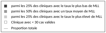 Ce graphique présente les résultats des cliniques liés à la proportion de cas (patients concernés par au moins une mesure limitative de liberté), sans ajustement des risques du 01.01.2021 – 31.12.2021. Seules les cliniques ayant appliqué au moins une mesure limitative de liberté durant la période de relevé sont représentées. Au total, 4'062 traitements stationnaires dans 20 (sur 31) cliniques ont pu être évalués.