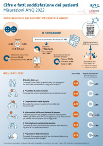 Nella quinta misurazione nazionale della soddisfazione dell’ANQ, pazienti adulte e pazienti adulti ricoverati in psichiatria e dimessi tra il 1° aprile e il 30 giugno 2022 hanno valutato diversi aspetti della propria degenza. La valutazione si compone di un totale di 7’791 questionari provenienti da 94 cliniche. Il tasso di risposta è stato del 56,6%, quindi più alto di quello dei sondaggi precedenti.