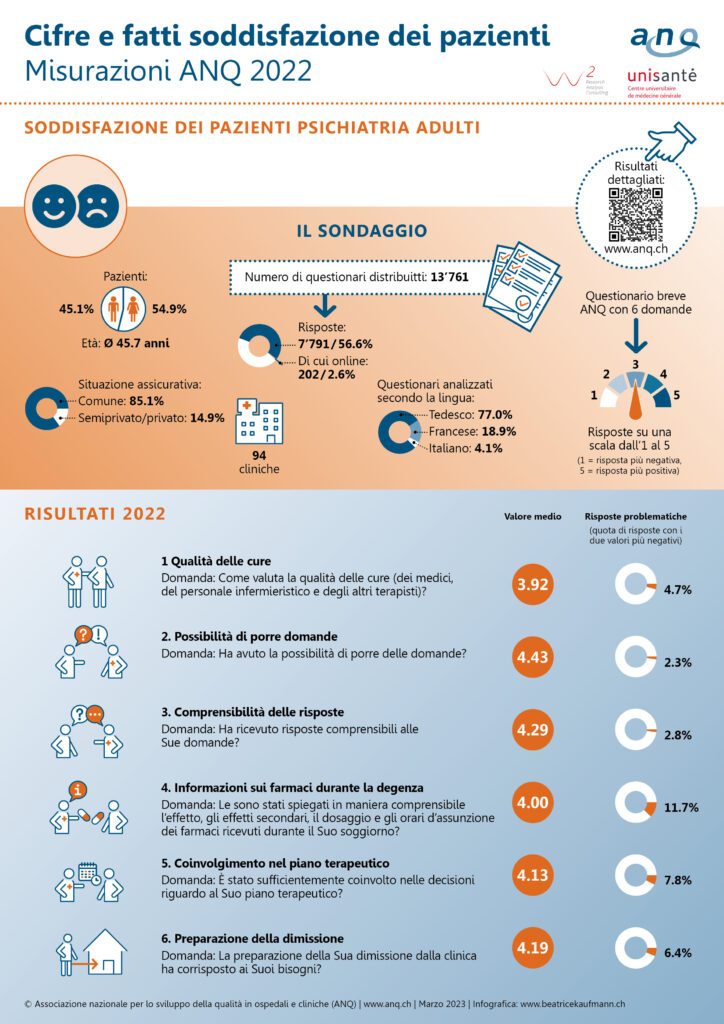 Oggi l’Associazione nazionale per lo sviluppo della qualità in ospedali e cliniche (ANQ) ha pubblicato i risultati del quinto sondaggio sulla soddisfazione dei pazienti sull’intero territorio svizzero nella psichiatria per adulti stazionaria. La valutazione comprende le opinioni di quasi 7'800 pazienti sottoposti a trattamento tra aprile e giugno 2022. Ancora una volta le cliniche psichiatriche valutate hanno ricevuto un riscontro molto positivo.